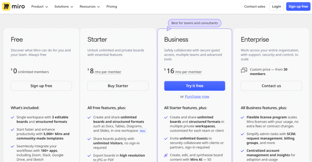 Miro focuses heavily on collaboration. The free experience is useful for small tasks, but teams quickly reach a point where more boards, advanced permissions, or integrations become essential. The free plan showcases the product, but the paid plan unlocks its full purpose.
